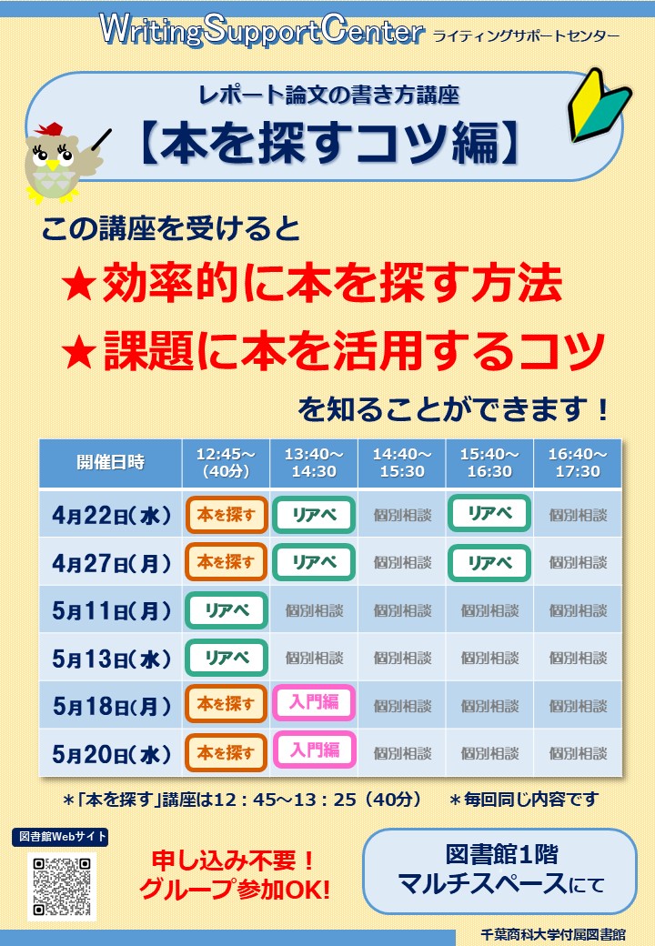 !新入生必見!WSC「レポート論文の書き方講座【本を探すコツ編】」のお知らせ