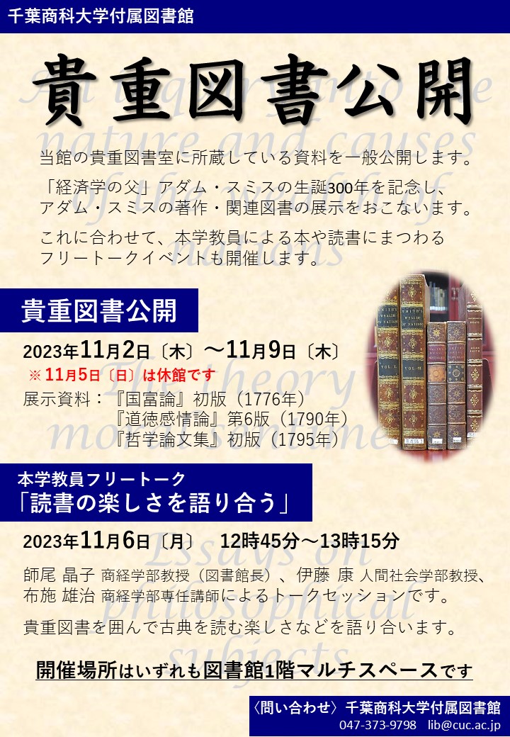 千葉商科大学付属図書館では、トマス・ホッブス『リヴァイアサン』やアダム・スミス『国富論』の初版本をはじめとした、多数の貴重図書を収蔵しています。 またコレクションとして、世界的経済学者ロイ・ハロッドが残した書簡を中心とするロイ・ハロッド文書や、経済学者バート・ホゼリッツの蔵書を収集したバート・ホゼリッツ文庫があります。
