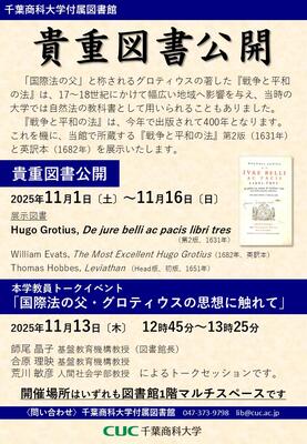 『戦争と平和の法』は、1625年にパリで初版が出版された。フーゴー・グロティウス(1583-1645年)は生涯にわたり本書の改訂作業を続け、1631年・1632年・1642年・1646年と改訂版を出版した。本学所蔵の本書は、1631年版で第2版にあたる。この版は、グロティウスが亡命先のパリからオランダへと戻った年に、オランダの印刷所から出版された。 『戦争と平和の法』は17-18世紀にかけて幅広い地域へ影響を与えた。特にオランダやドイツ、スウェーデンの大学では自然法の教科書として用いられた。